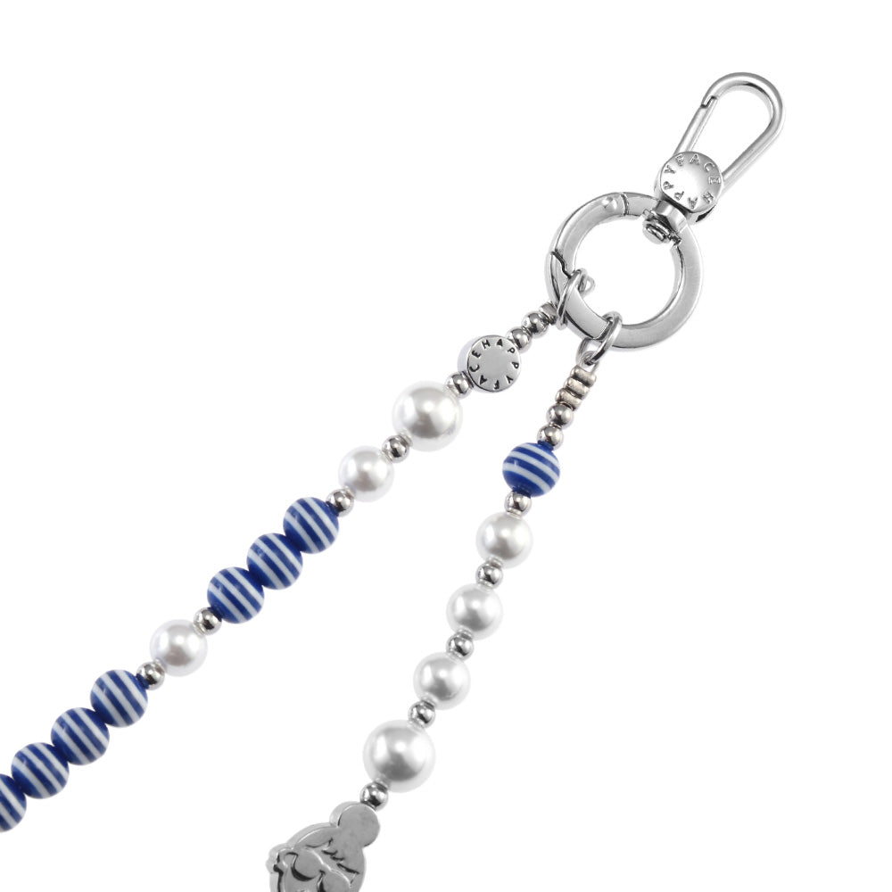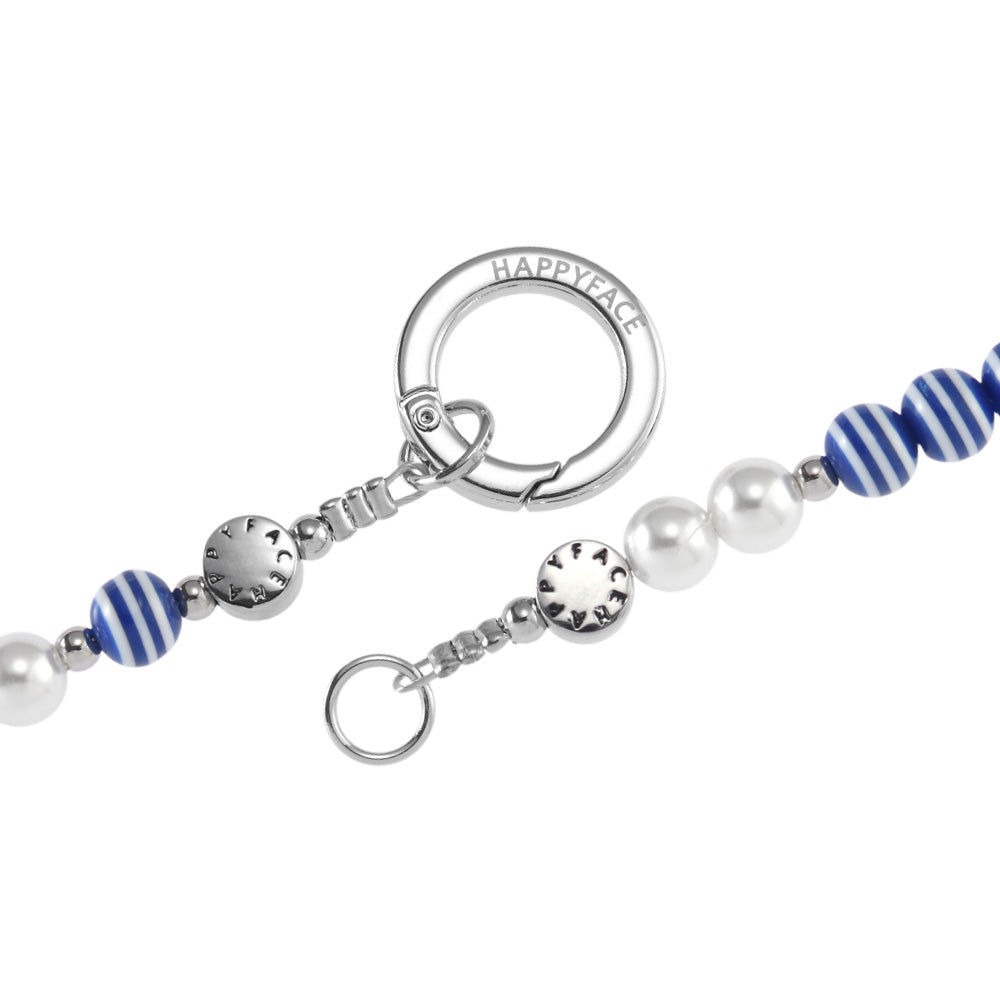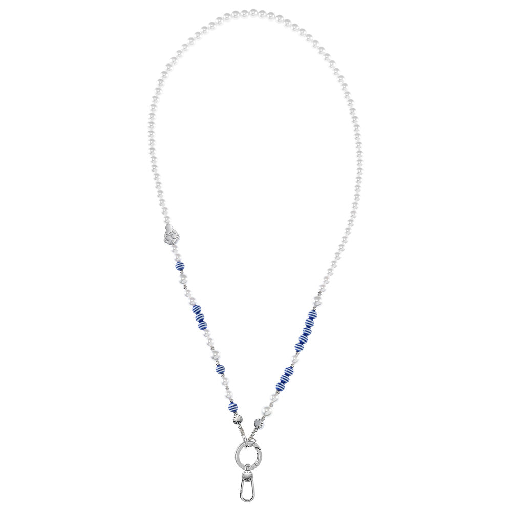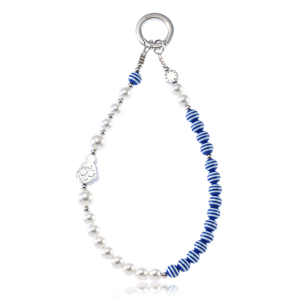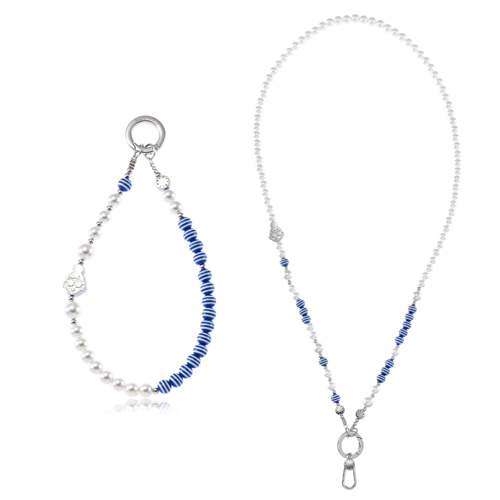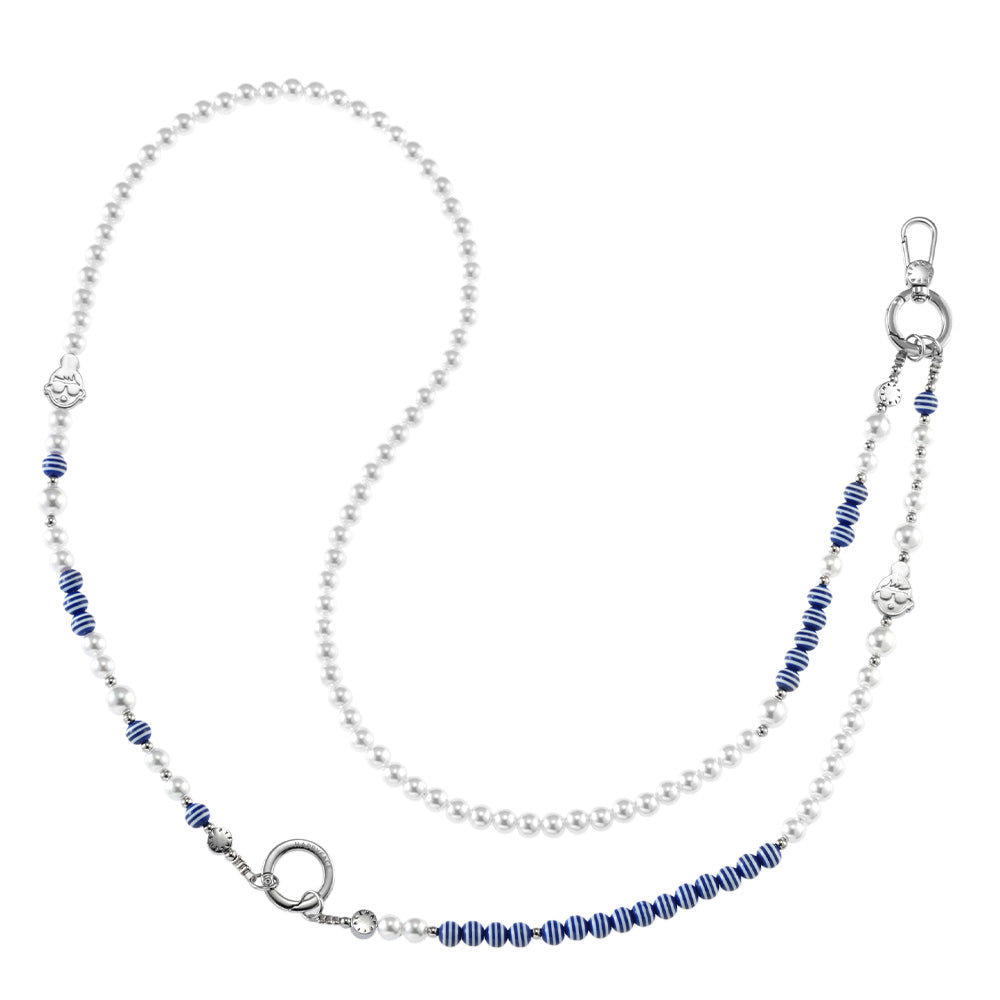 以亮白珍珠串起整體質感,搭配深藍色貝殼圓片點綴,